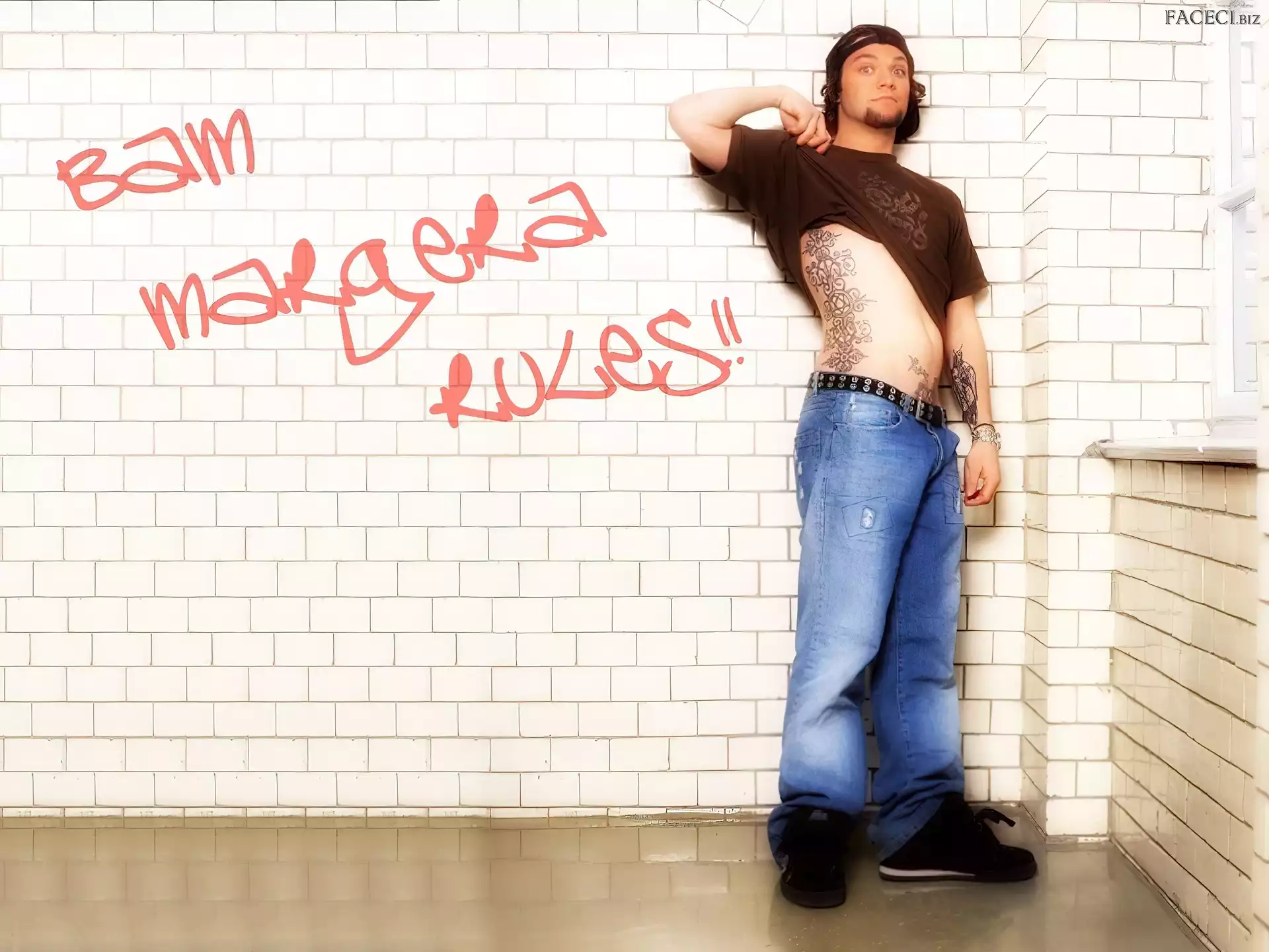 t-shirt, Bam Margera, brązowy okulary, Bam Margera, butelka kurtka, Bam Margera, rozpięta okulary, Bam Margera, twarze zegarek, Bam Margera, deskorolka włosy, Bam Margera, ciemne